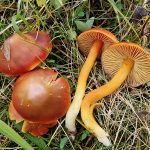 7-10 cm visok in 1-2 cm debel, pogosto neenakomerno sploščen v bližini dnišča, kriv, rumeno oranžen do oranžen, dnišče je rumeno in nekoliko ožje, gladek, brez obroča.