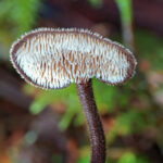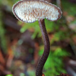 Majhna gobica z igličasto trosovnico, ekscentrično priraslim klobukom in z rastiščem na storžih.