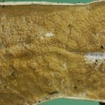 Na površini trosnjaka, sprva gladka, nato nagubana, gubasto razpokana do merulioidna (specifično nagubana), lahko tudi z nepravilnimi porami, krem do oranžna.