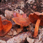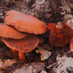 Lističi so sorazmerno gosti, barve cinabarita do rjavo rdeči, rdeči odtenek ostaja, ostrinka je bolj bleda.