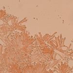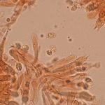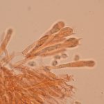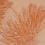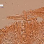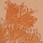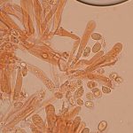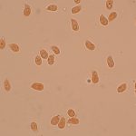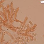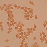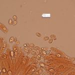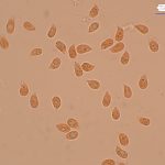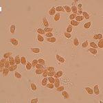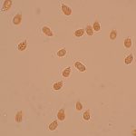 7–9 × 4–5 µm, elipsasti, gladki, brezbarvni. Trosni prah je bel.