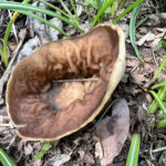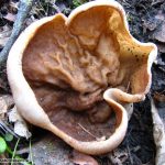 Od 4 do 15 cm širok, bolj ali manj rjavih barv, prepreden z žilami, naguban, s podvihanim robom, spodnja stran belkasta.
