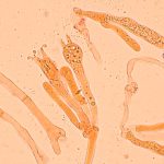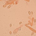 8–11 × 4–6 µm, elipsasti, gladki, brezbarvni. Trosni prah je bel.