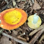 Srednje velika golobica z oranžno rdečim, rumenim klobukom, z rumenkastimi lističi in rumenkastim betom.