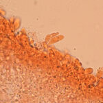 6–8,5 × 3,5–4,5 µm; elipsoidni, gladki, brezbarvni (hialini); Q približno 1,7–2,1; trosni prah bel.